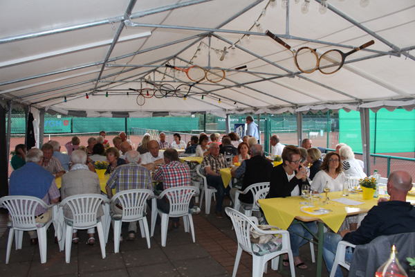 Gut 100 Mitglieder und Tennisfreunde waren der Einladung zur Feier am Samstagabend gefolgt und haben ihr Kommen bestimmt nicht bereut. Auffällig war die ausnahmslos gute Stimmung bei Allen zu dem natürlich auch der äußere Rahmen beitrug. Das festlich geschmückte Zelt über der Terrasse war in der Größe ideal, die neuen Türen vom Clubhaus auf die Terrasse haben sich voll bewährt und das von Conny Wöhrmeyer neu dekorierte Clubhaus war wunderbar.