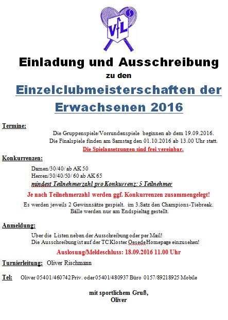 Aufgrund der Terminkollision mit dem Oktoberfest in Kloster Oesede gibt es einen neuen Termin für die Vereinsmeisterschaften.